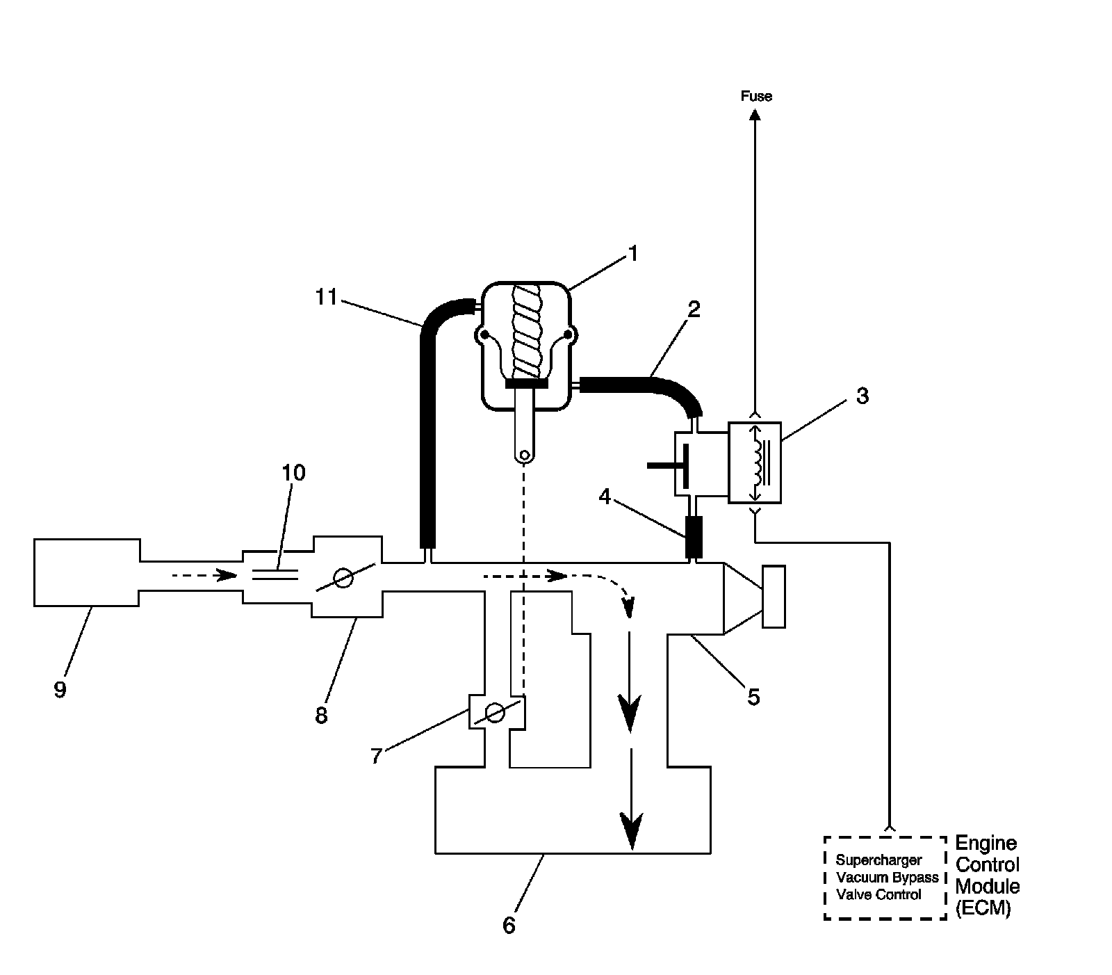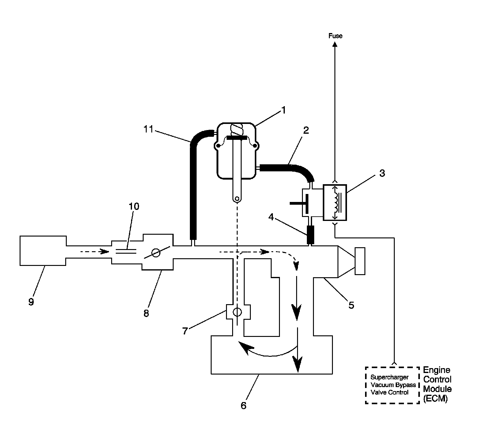 The ECM controls boost pressure by using the boost control solenoid. The boost control solenoid is normally an open valve. Under most conditions, the ECM commands the boost control solenoid to operate at a 99-100 percent duty cycle. This keeps the solenoid valve closed and allows only inlet vacuum to control the position of the bypass valve. At idle, engine vacuum is applied to the upper side of the bypass valve actuator, counteracting spring tension to hold the bypass valve open. As engine load is increased, engine vacuum is decreased, causing the spring in the bypass valve actuator to overcome the applied vacuum, closing the bypass valve and allowing the boost pressure to increase. The bypass valve starts to close when the vacuum measures 250 mm Hg (10 in Hg) and is fully closed at 90 mm Hg (3.5 in Hg). When reduced boost pressure is desired, the ECM commands the boost control solenoid to operate at a 0 percent duty cycle, but may command a partial duty cycle, approximately 62 percent, depending on the operating condition. This opens the solenoid valve and allows boost pressure to enter the bypass valve actuator at the lower side to counteract the spring tension, opening the bypass valve and re-circulating excess boost pressure back into the supercharger inlet.
