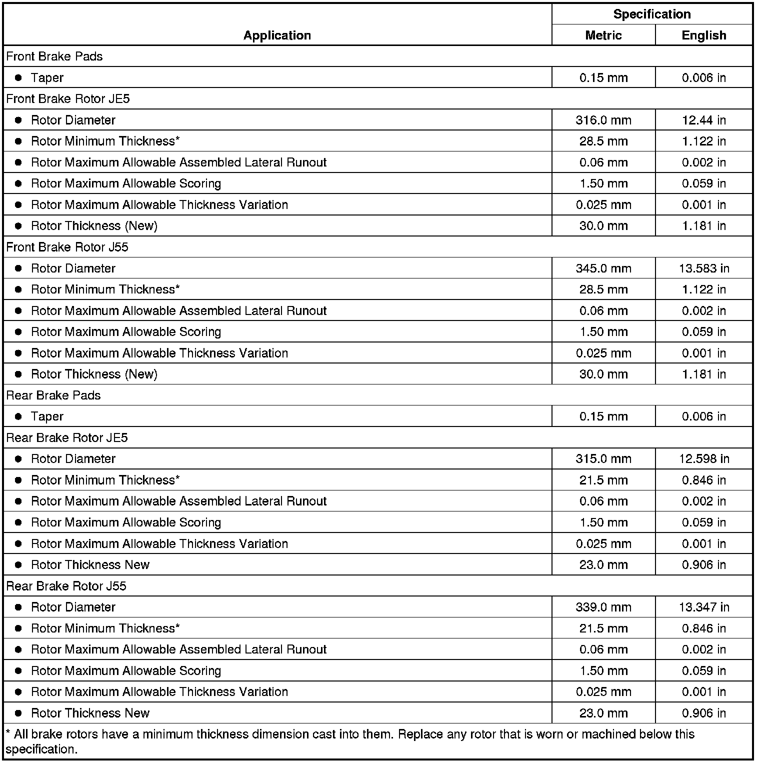 Disc Brake Component Specifications