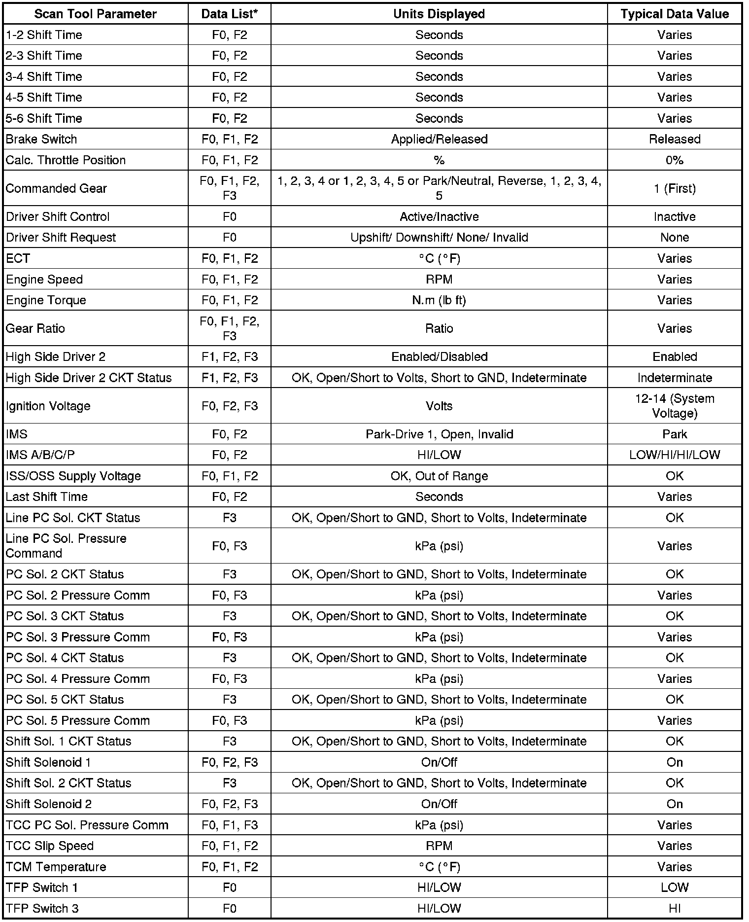 Only the parameters listed below are used in this manual for diagnosing. If a scan tool displays other parameters, the values are not recommended by General Motors for use in diagnosis.