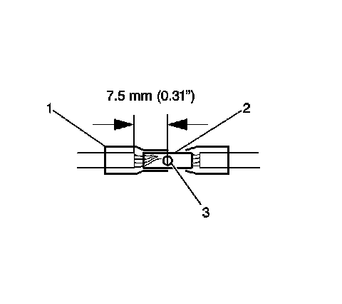 6. Place the Dura Seal splice sleeve in the nest. Ensure that the crimp falls midway between the end of the barrel and the stop. The sleeve has a stop (3) in the middle of the barrel (2) in order to prevent the wire (1) from going further. Close the hand crimper handles slightly in order to firmly hold the Dura Seal splice sleeve in the proper nest.