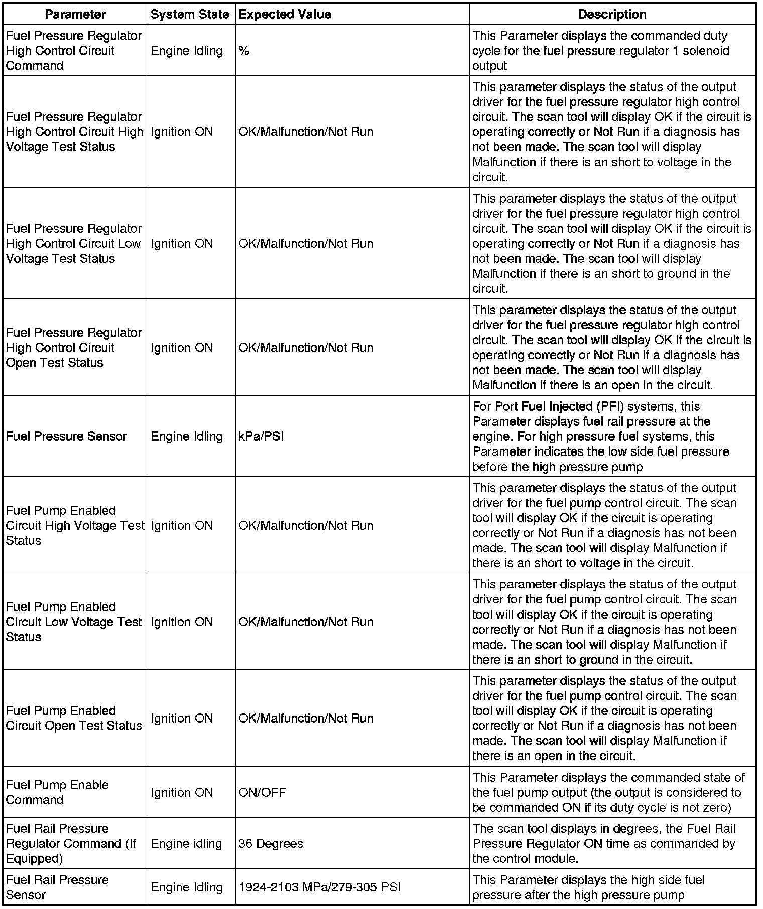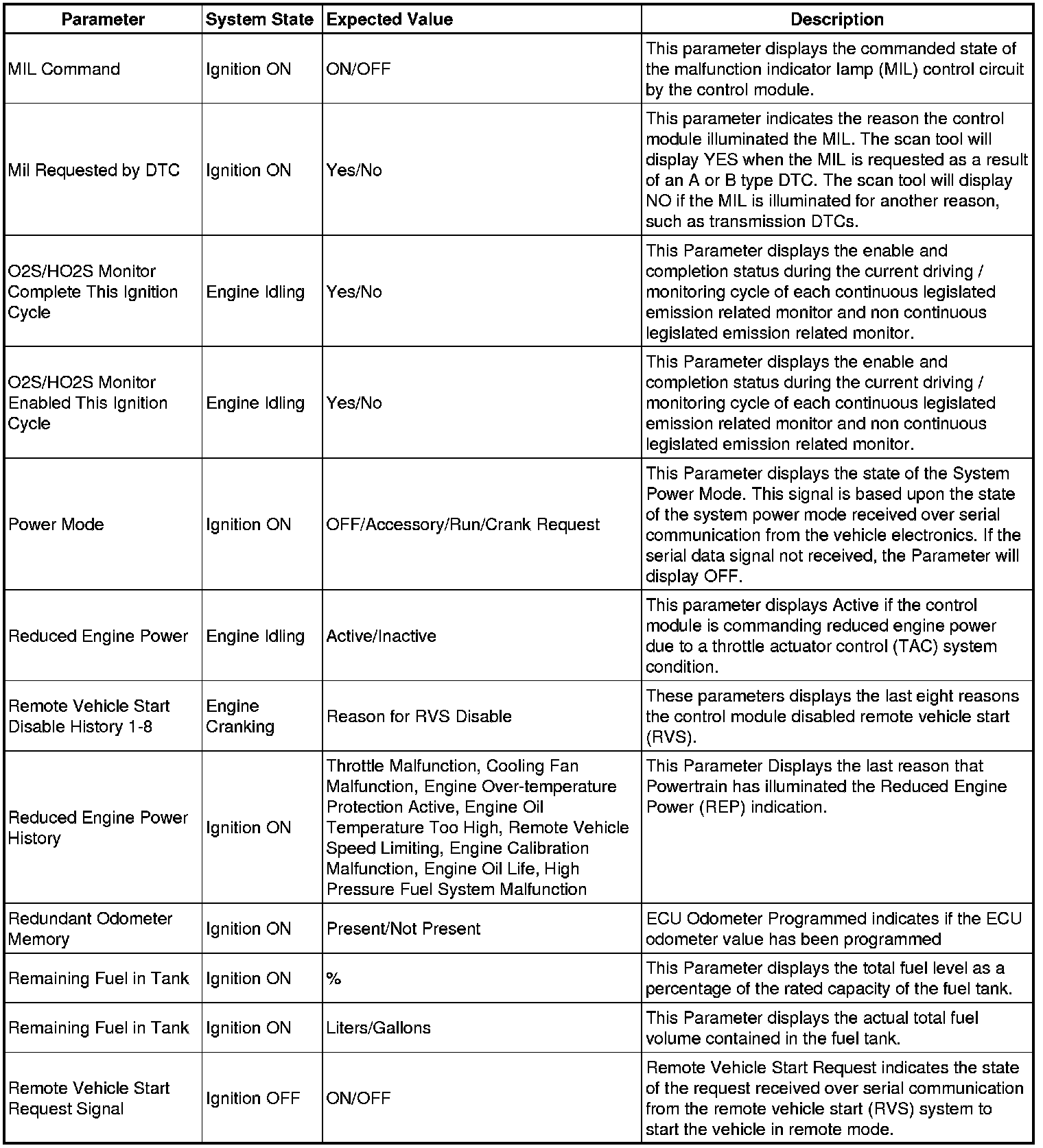 Only the parameters listed below are referenced in this service manual for use in diagnosis.