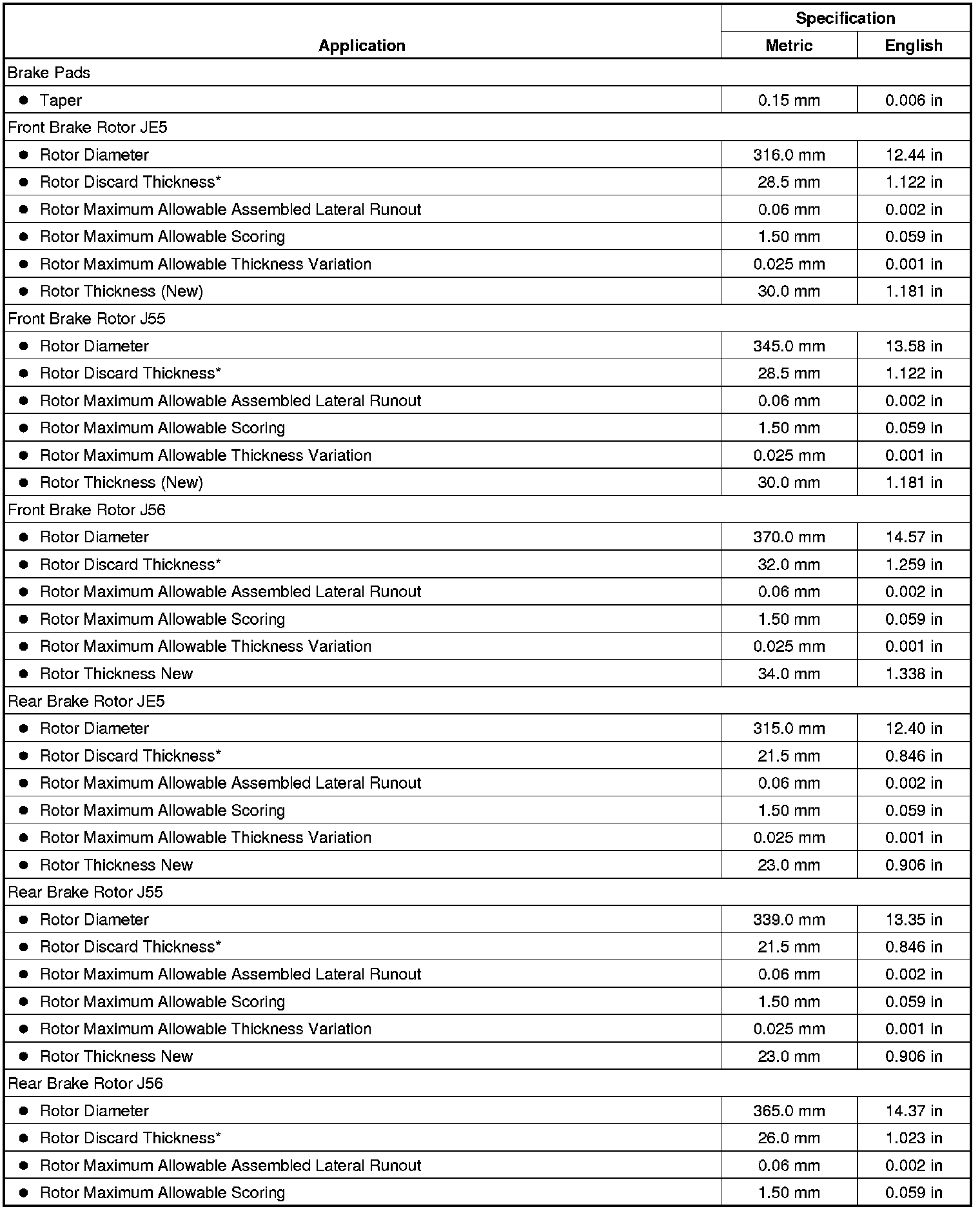 Disc Brake Component Specifications