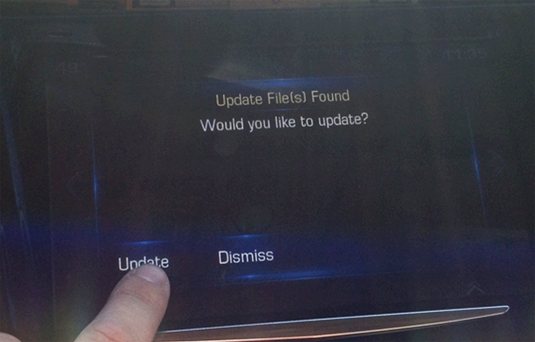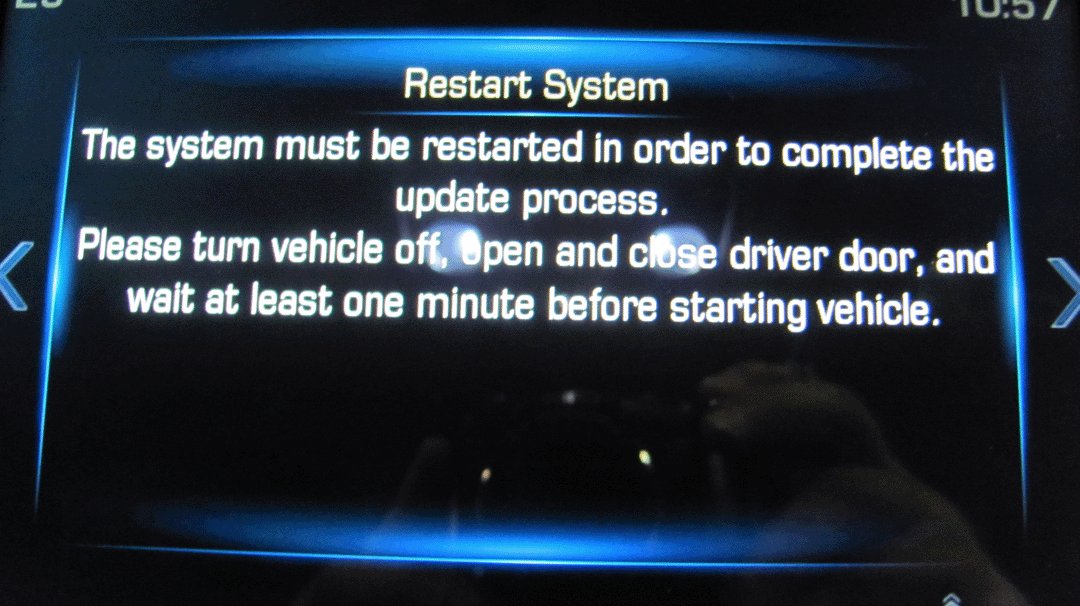 Update Complete screen for CUE system equipped with navigation system shown. Update Complete screen for CUE system without navigation is similar.