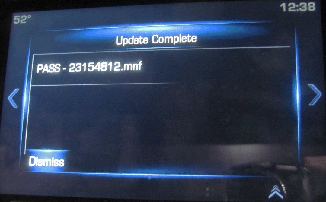 If the "Calibrate Device" screen is NOT displayed, the Update Complete screen will appear on the display. The screen includes the following message: Pass --- 23154812.mnf or Pass 23152613.mnf. Programming the Human Machine Interface Control Module (HMI) using TIS2WEB is NOT required. Perform step 10 and then proceed to step 14.