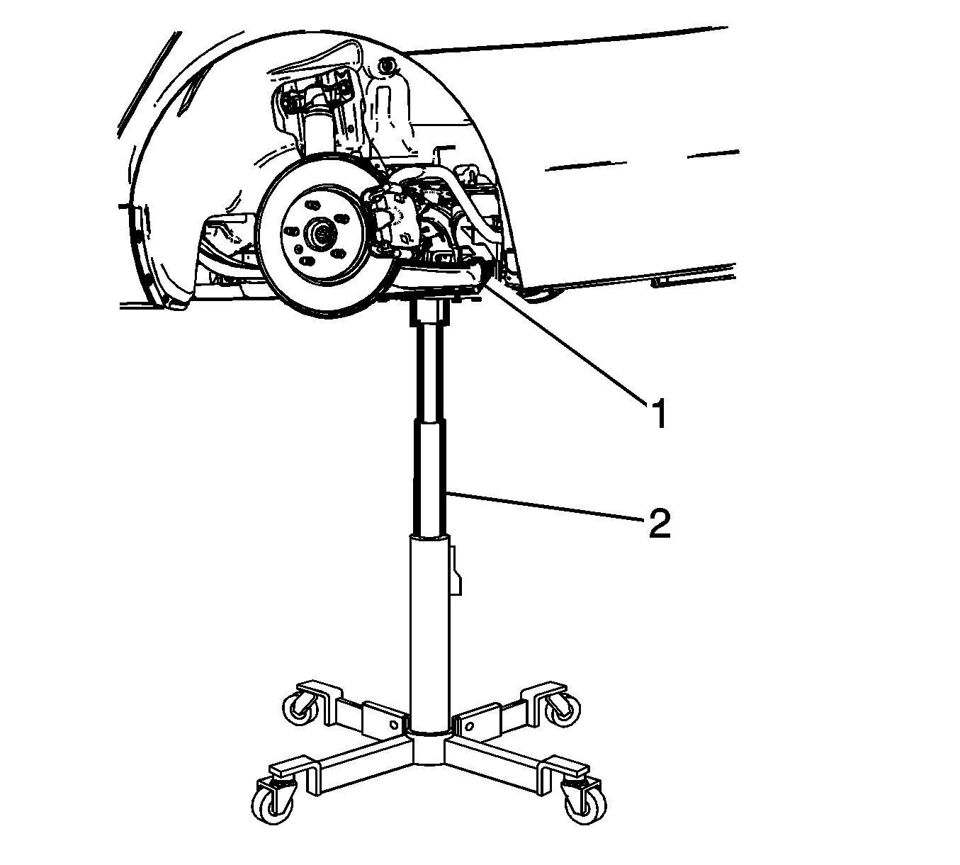 9.Support the lower control arm (1) with a suitable jack stand (2).