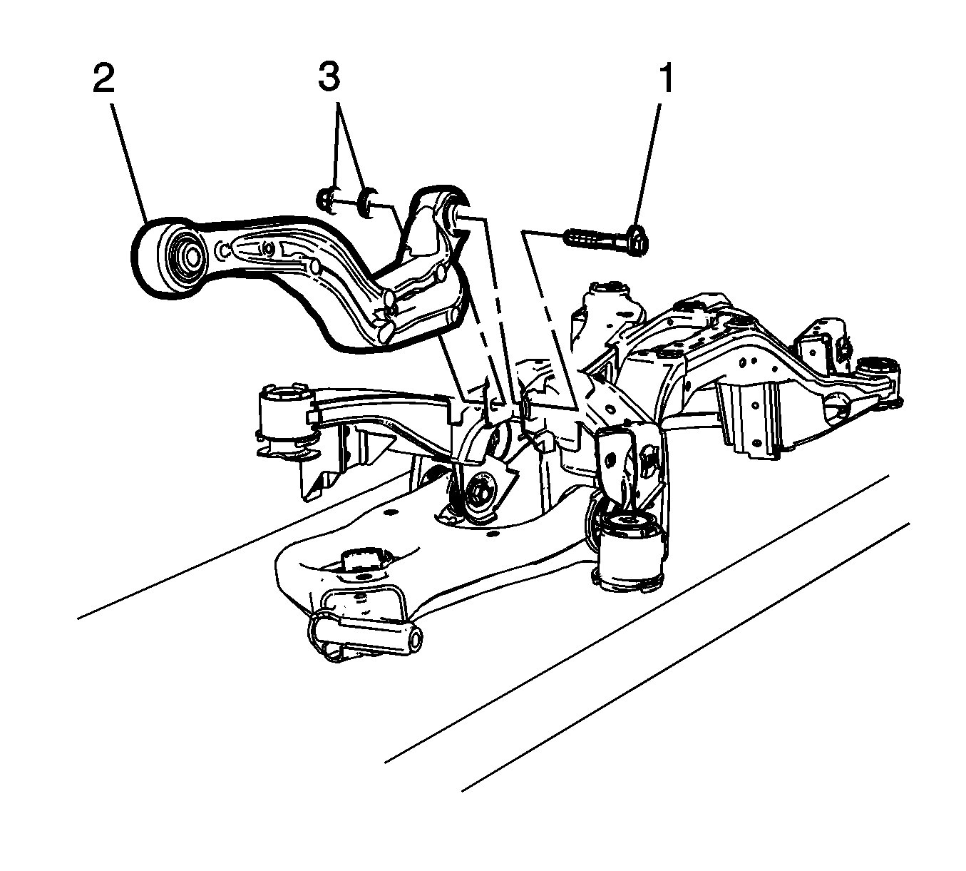 1.Position the lower control arm (3) in the rear suspension support.
