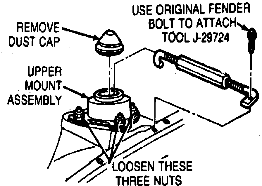 Caster adjustments are made by moving the position of the upper strut mount assembly. Fig. 3.To make adjustment, remove dust cap and fender bolt and attach tool J-29724 to original fender bolt, Fig. 4. Tighten the turnbuckle and loosen the three strut mount attaching nuts.