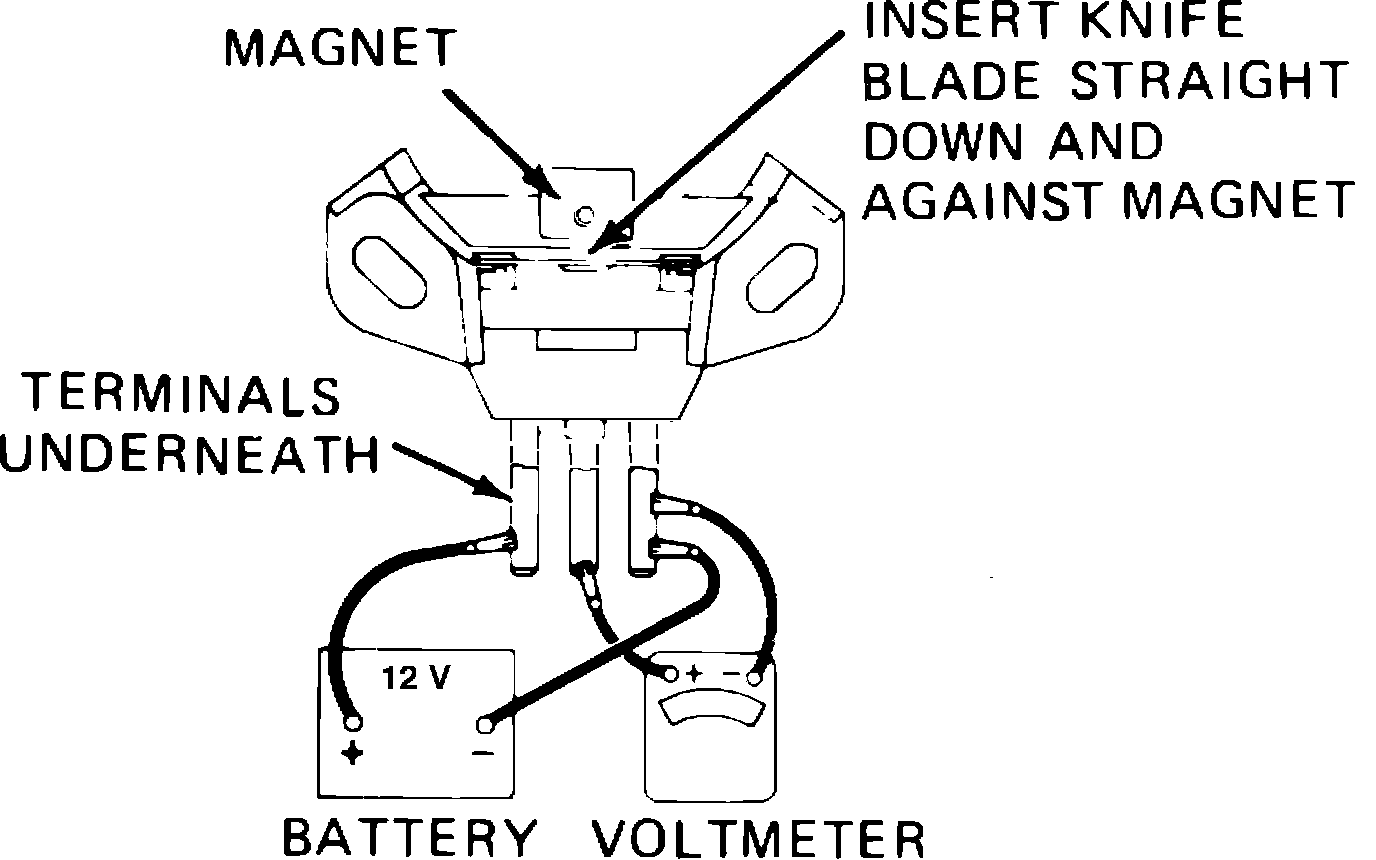 3. Insert knife blade as shown in Fig. 14. Voltmeter should read within 0.5 volts of battery voltage. If not, replace Hall Effect switch.