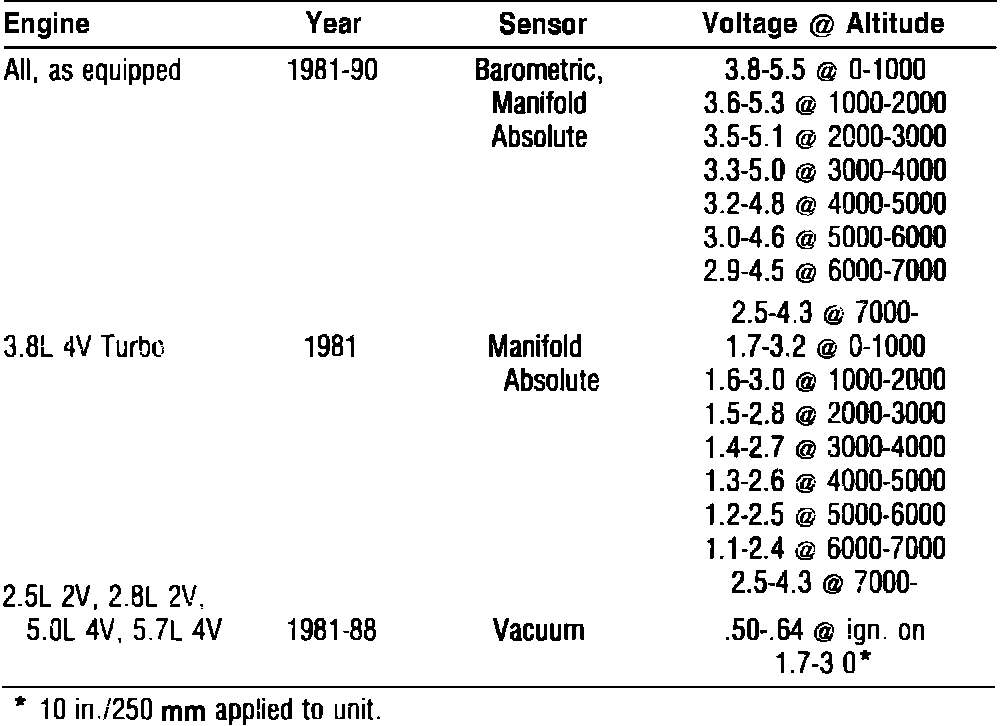 Manifold Absolute Pressure Sensors: Measure voltage with ignition on and engine off. Start engine and apply 10 in./250 mm Hg to unit, voltage should be: 3.8L Turbo 4V, 0.9-1.7 volts less; others, 1.2-2.3 volts less.