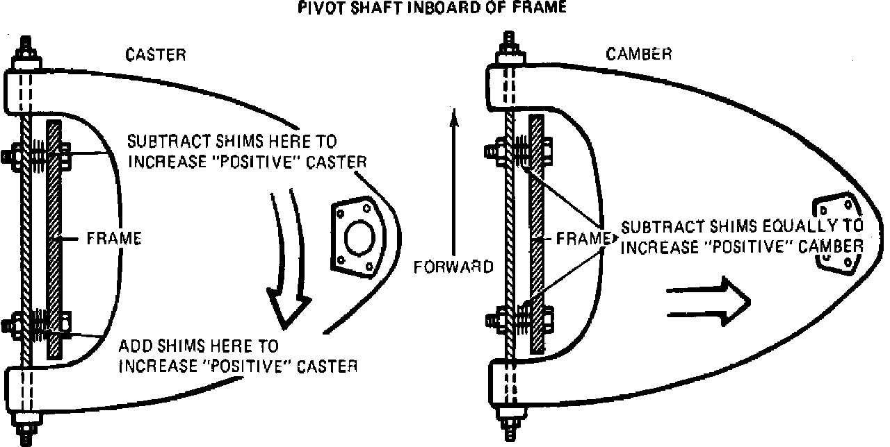Caster and camber adjustments are made by shims inserted between upper control arm shaft and frame bracket, Fig. 1. Add, subtract or transfer shims as noted below.