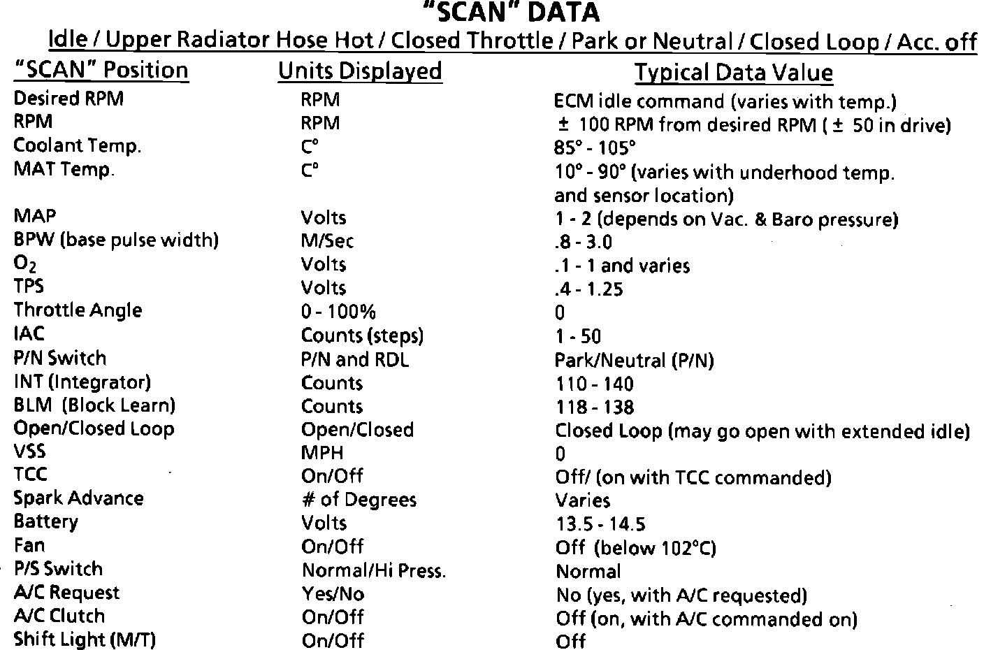 Scan Data Table (Typical Values):