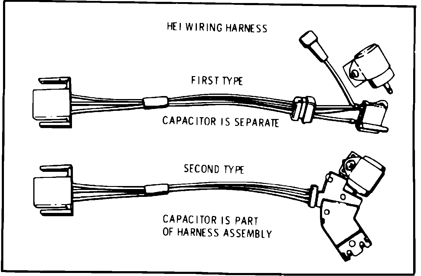 3. Remove two mounting screws and remove module, Fig. 13. Two types of H.E.I. wiring harness are used, Fig. 14. The second type is a wiring harness, connector and capacitor which is serviced as an assembly.