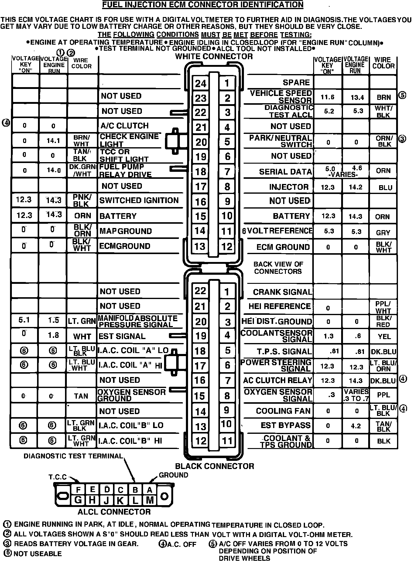 ECM Connector Terminal Identification & Voltage Specifications.: