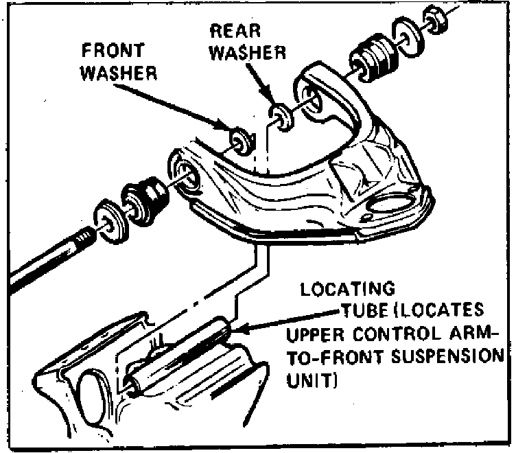 Caster angle is adjusted by rearranging washers located at both ends of the upper control arm, Fig. 1. A kit consisting of two washers, one of 3 mm thickness and one of 9 mm thickness, must be used when adjusting caster angle.