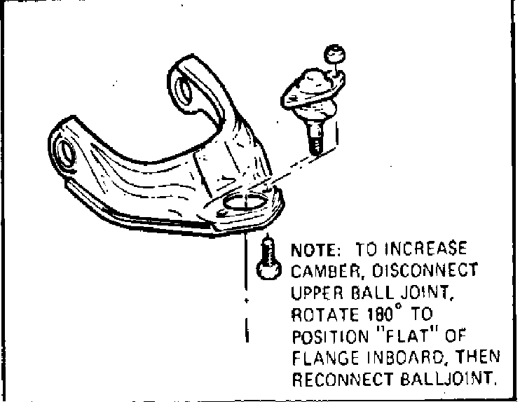 Camber is adjusted by removing the upper ball joint, rotating it 1/2 turn and reinstalling it with flat of upper flange on inboard side of control arm, Fig. 2. This will increase positive camber by approximately 1°.