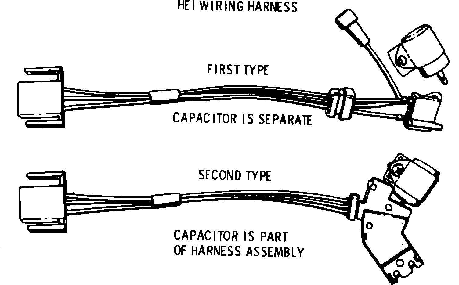 3. Remove two mounting screws and remove module, Fig. 12. Two types of H.E.I. wiring harness are used, Fig. 13. The second type is a wiring harness, connector and capacitor which is serviced as an assembly.