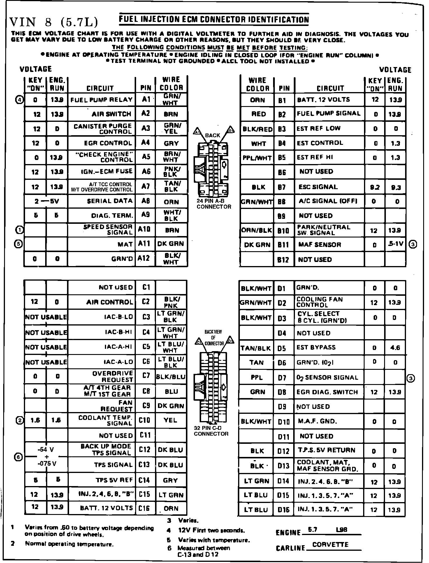 Fig. 015 ECM Connector Terminal Identification & Voltage Specifications: