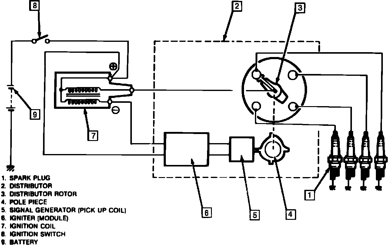 The principle components of this solid state ignition system are the spark plugs, ignition coil and distributor assembly. The distributor incorporates a rotor, module, pole piece, ignition coil on 1986 - 88 models, vacuum advance and centrifugal advance.