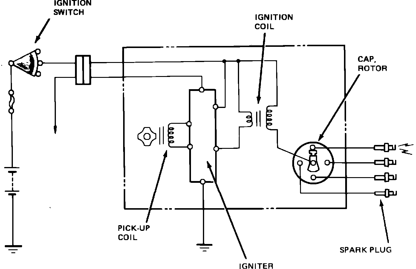 When the distributor shaft rotates, the magnetic flux passing through the pickup coil varies due to the change in air gap between the pickup coil and the pole piece. As a result, alternating current is induced in the pickup coil. The voltage induced, switches ON and OFF the module assembly which switches OFF the ignition coil primary current. High voltage is induced within the secondary winding of the ignition coil and ignition sparks are generated at the spark plugs.