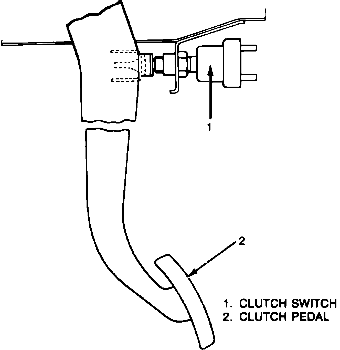 Engine speed is computed based on pulse signals transmitted from the electronic ignition system. On manual transmission models, clutch engagement is monitored by a switch located above the clutch pedal, Fig. 5. The switch is open when the clutch is engaged (pedal released), and closed when the clutch pedal is depressed.
