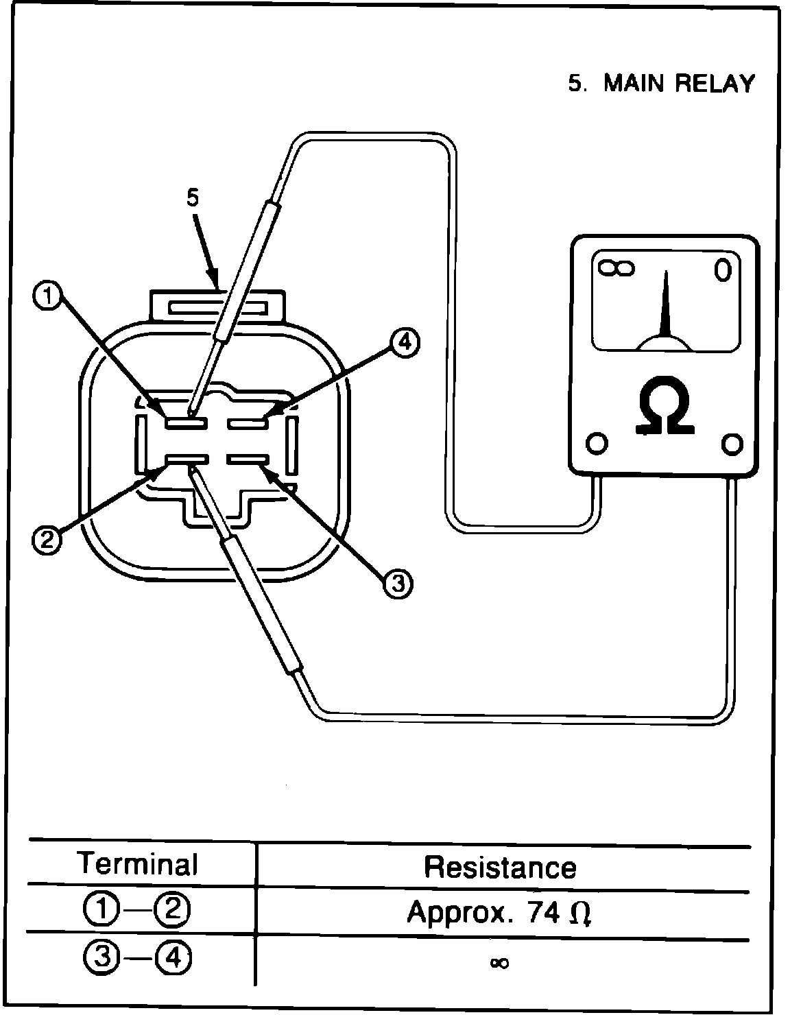 3. With ignition switch ``Off,'' remove main relay and disconnect electrical connector. Check resistance between each terminal as shown, Fig. 17.