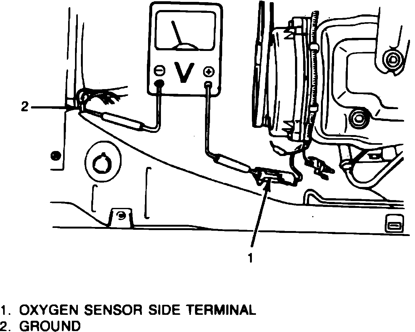 3. Connect voltmeter between oxygen sensor side terminal and ground, Fig. 21. Use high quality or digital voltmeter. Do not apply any voltage to oxygen sensor.