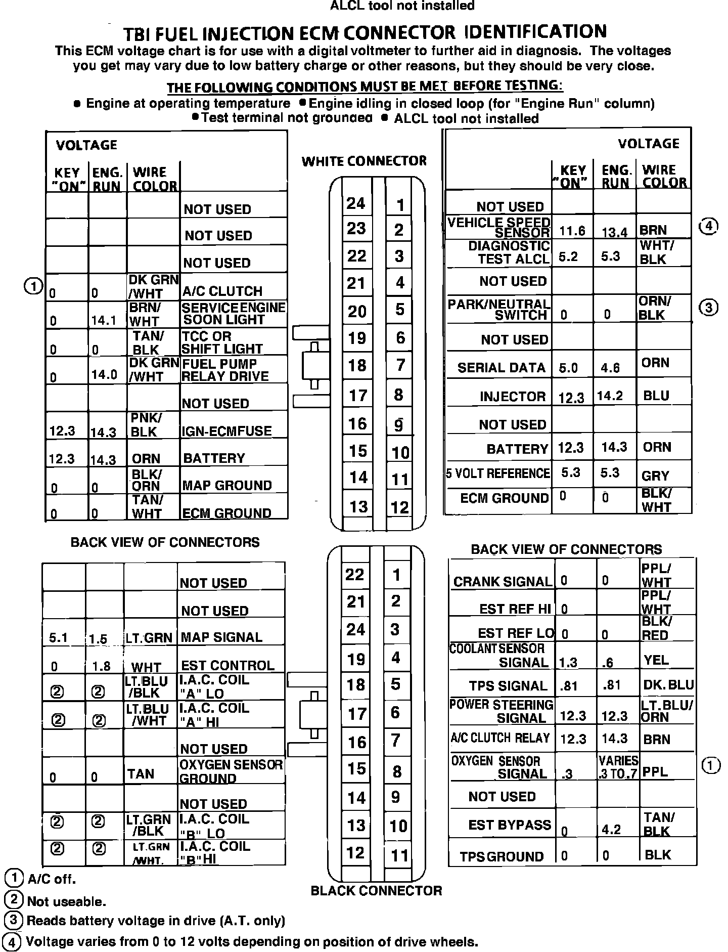 ECM Connector Terminal Identification & Voltage Specifications.: