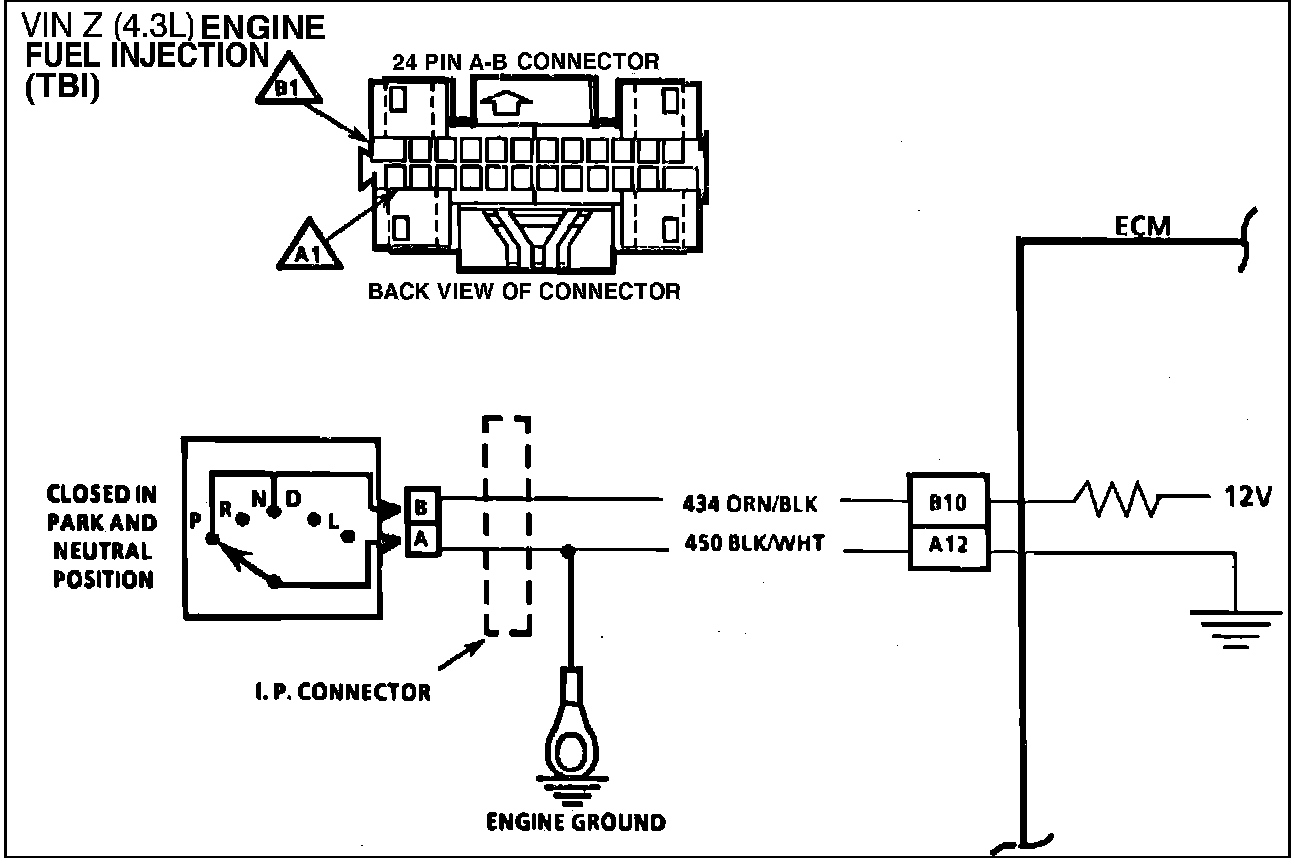 The Park/Neutral Switch is closed to ground in Park or Neutral and open in Drive ranges. The ECM supplies 12 volts through an internal resistor to CKT 434 and senses that the switch is closed when the voltage at terminal B10 drops to less than 1 volt.