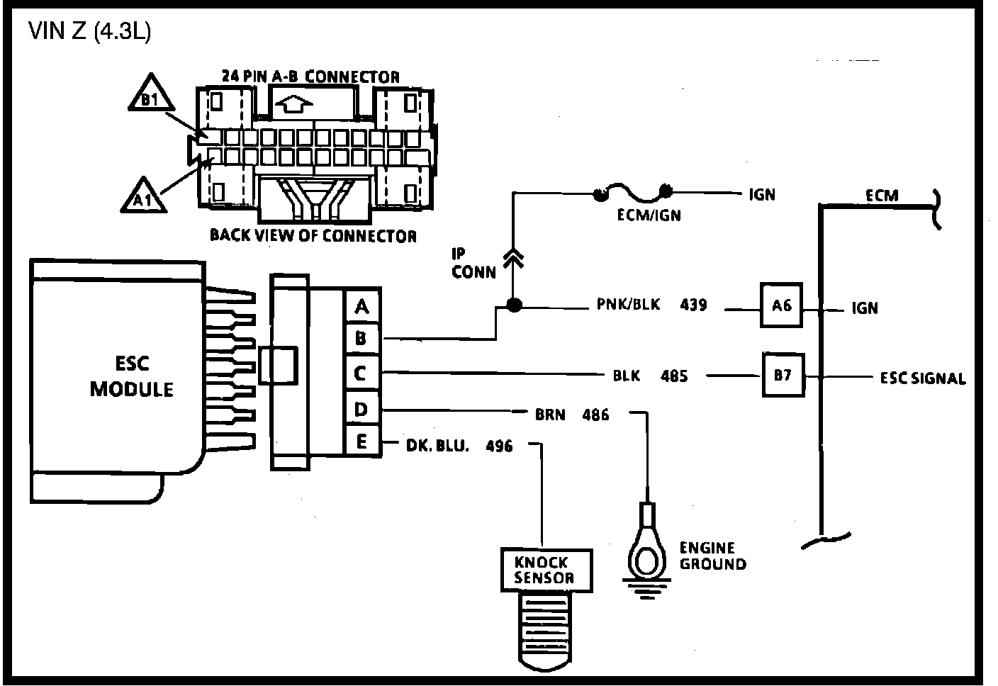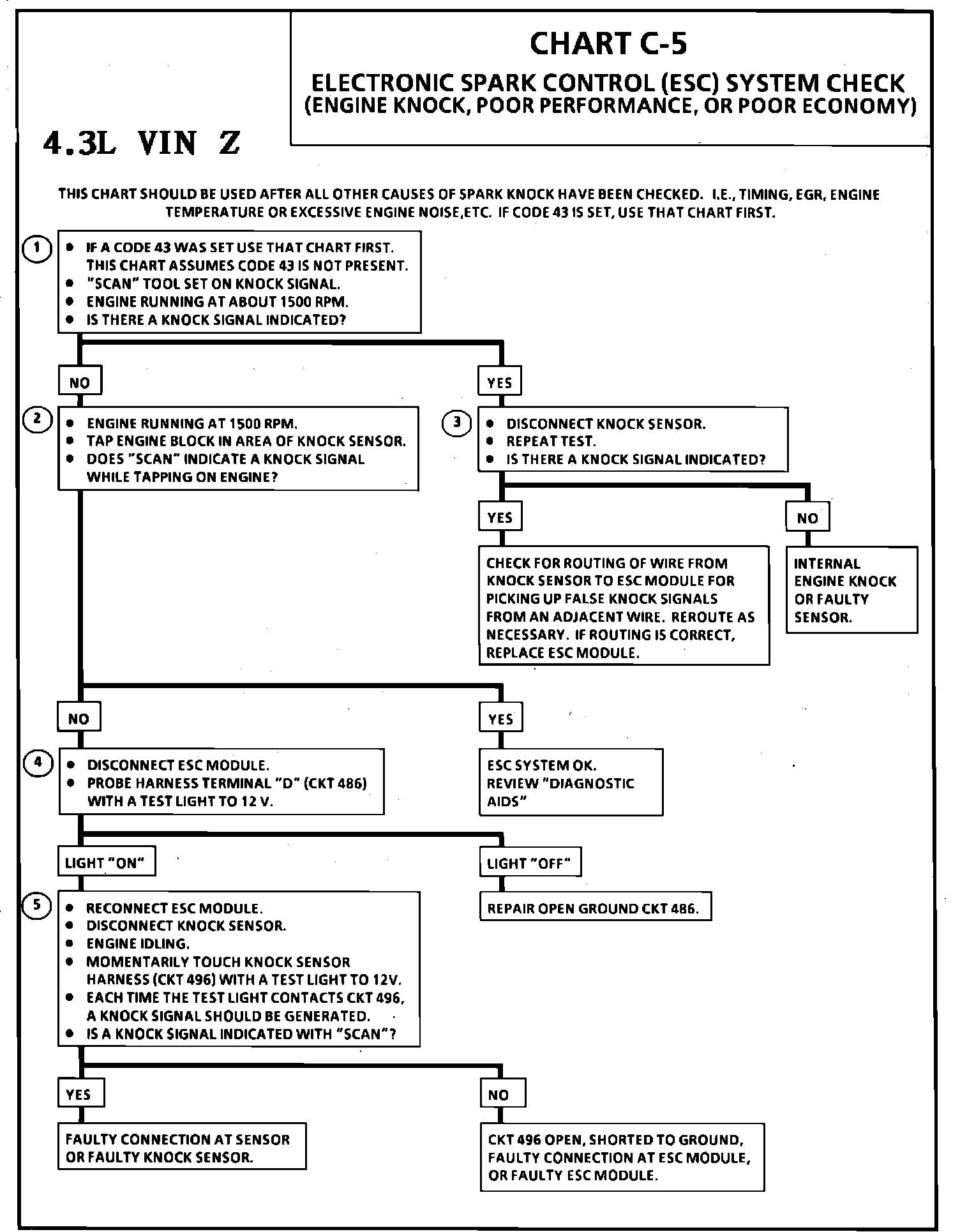 5. Contacting a test light to 12 volts and CKT 496 should generate a knock signal determining if the problem is the knock sensor or the ESC module.