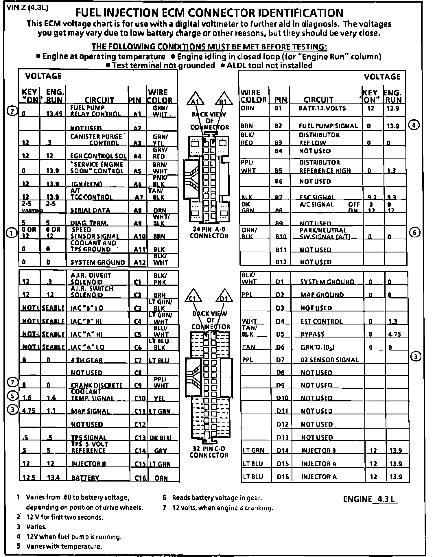 Fig. 014 ECM Connector Terminal I.D. & Volt. Specifications: