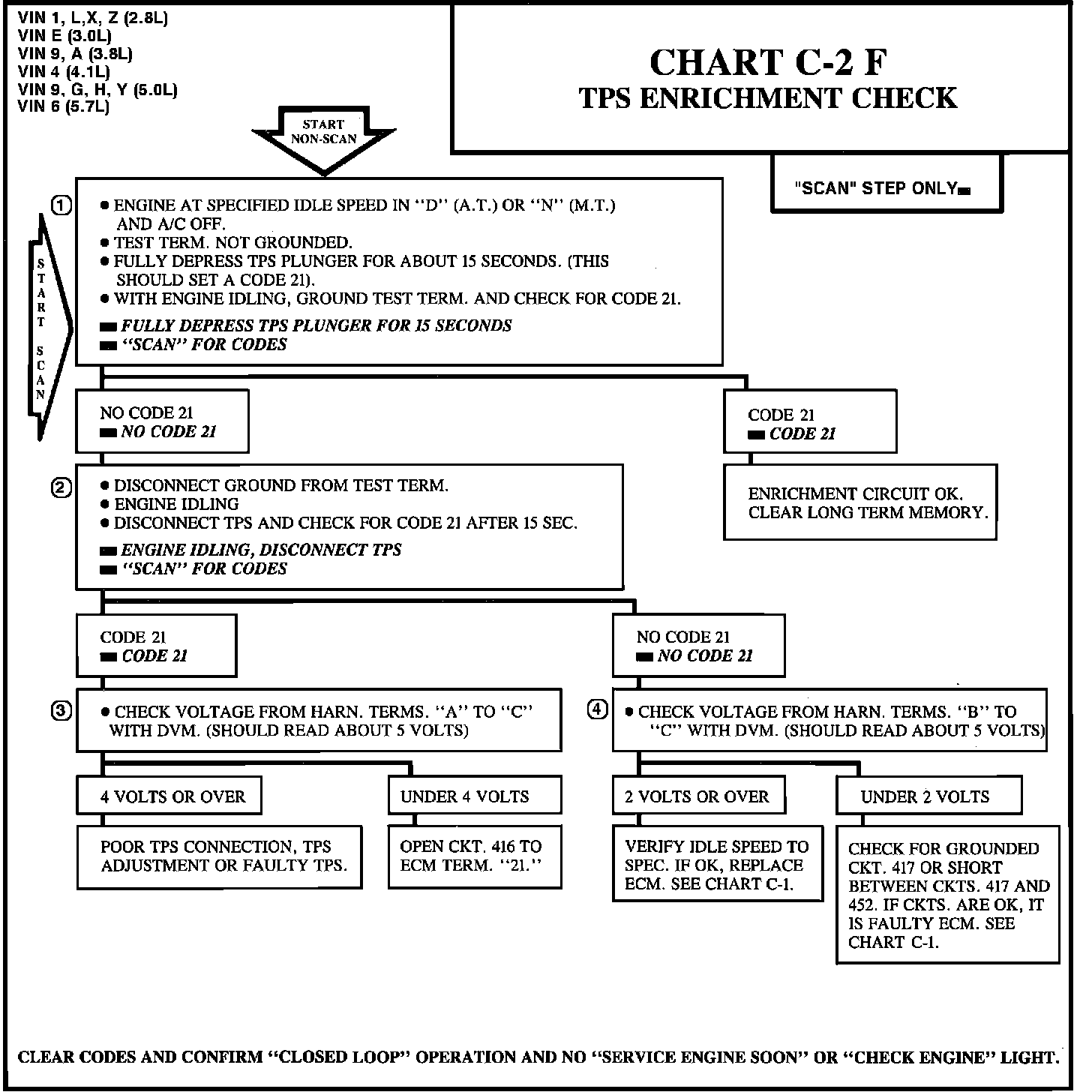 3. This step checks for 5V. ref. at TPS. It should be about 5 volts. If loss of V. Ref. were in the ECM,it should set Codes 21, 32 and 34 since this is the same 5V to MAP, BARO or Vacuum Sensors. Therefore, it must be an open CKT416.