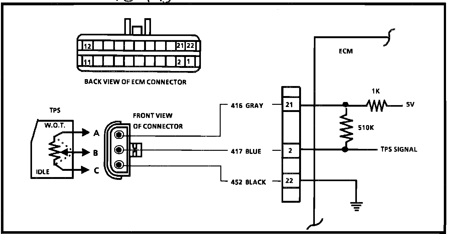 4. This step checks for a grounded CKT417. Normal circuit should read about 5 volts. Checking for grounded TPS output CKT417 to Terminal "2" of ECM,or shorted CKT417 to 452 from TPS, indicates whether fault is in wiring or ECM. A voltmeter with a 10 megohms resistance must be used for an accurate reading.