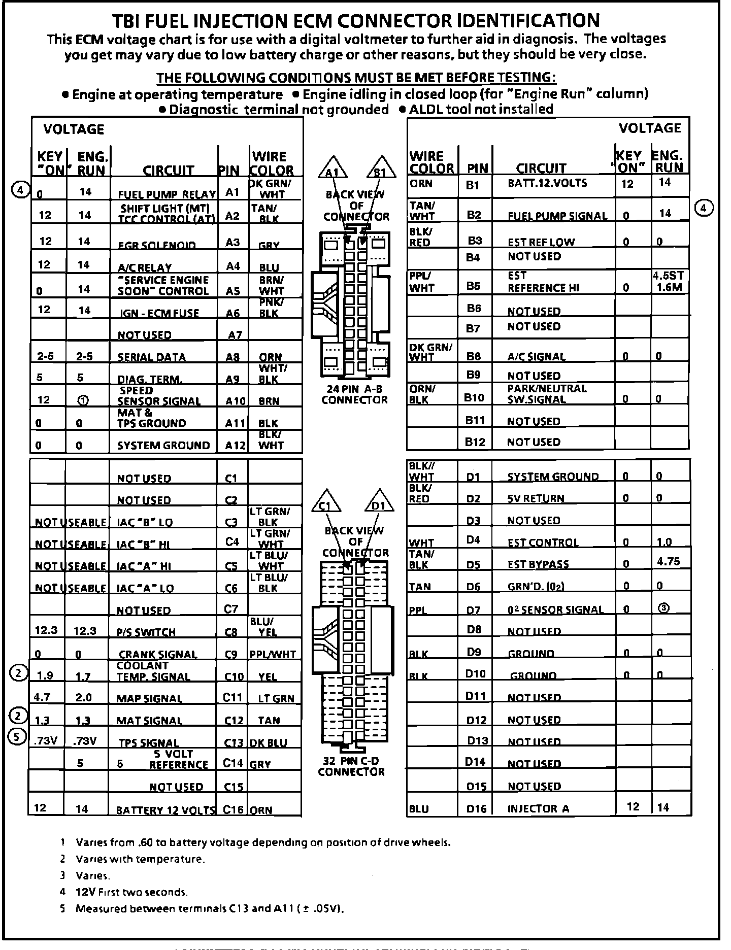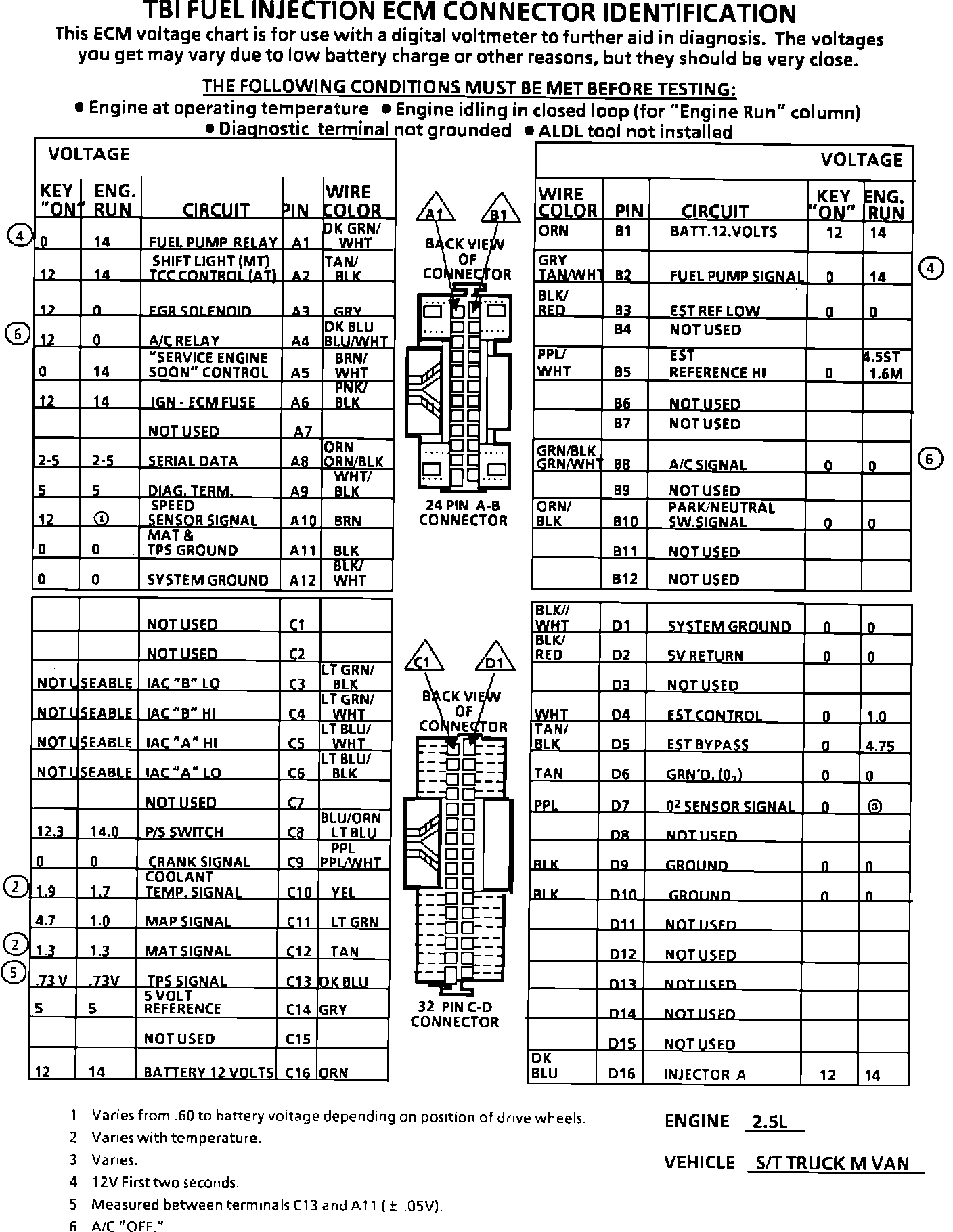 ECM Connector Terminal Identification & Voltage Specifications.: