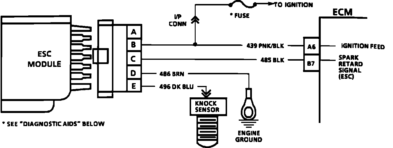 5. Contacting circuit 496, with a test light to 12.0 volts, should generate a knock signal to determine whether the knock sensor is faulty, or the ESC module can not recognize a knock signal.