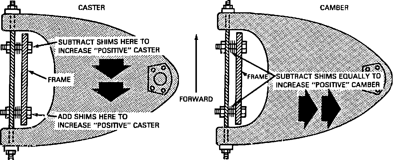 Transfer shims from front to rear or rear to front. The transfer of one shim to the front bolt from the rear bolt will decrease positive caster. One shim (1/32 inch) transferred from the rear bolt to the front bolt will change caster about 1/2 degree.