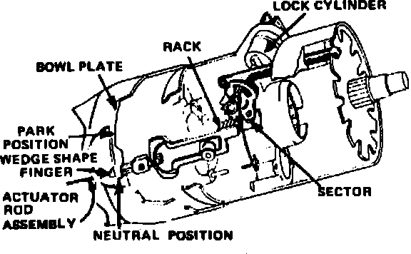 Actuation of the ignition switch is prevented by a mechanical lockout system, Figs. 3 and 4, which prevents the lock cylinder from rotating when the selector lever is out of Park or Neutral. When the selector lever is in Park or Neutral, the slots in the bowl plate and the finger on the actuator rod align, allowing the finger to pass through the bowl plate in turn actuating the ignition switch, Fig. 5. If the selector lever is in any position other than Park or Neutral, the finger contacts the bowl plate when the lock cylinder is rotated, thereby preventing full travel of the lock cylinder.