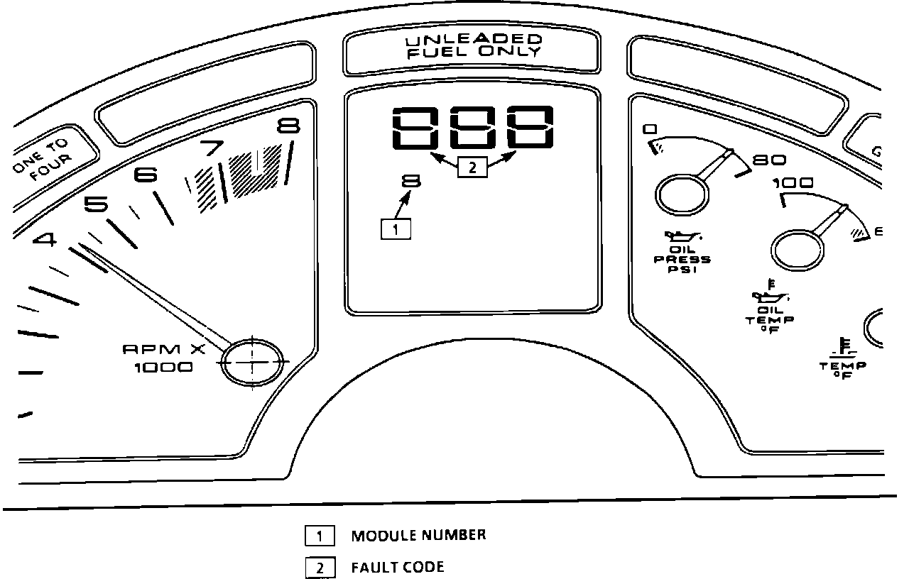 The particular module being interrogated is indicated on the trip monitor, and the codes are displayed on the speedometer. The speedometer also indicates if the fault code is current code or history code with a "C" or "H", respectively. All ECM and EBCM codes will be displayed by the CCM as history codes, whether they are current or history.