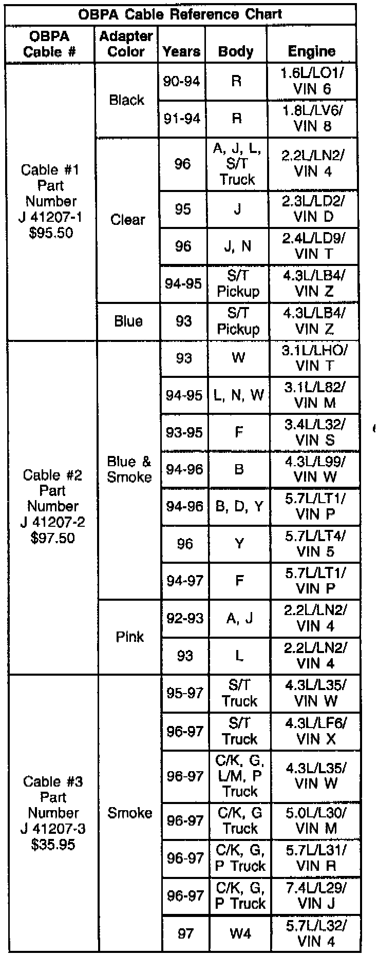 A modification to the OBPA is being offered by Kent-Moore to support these additional vehicles and to allow reprogramming using the Tech 2. The revisions to the OBPA for the Tech 2 is very important as the Tech 2 is the only tool used for service programming for 1997 and future vehicles. To have the modifications performed, contact Kent-Moore at (800) 345-2233. The revisions (part number J 41207 REV-C) are free of charge for GM dealerships/retailers.