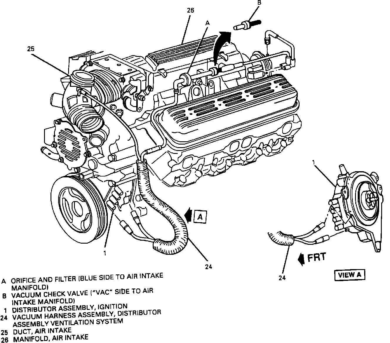 The distributor ventilation system consists of a vacuum line, orifice and filter and a one way check valve. The check valve and orifice are located on top side of the engine.
