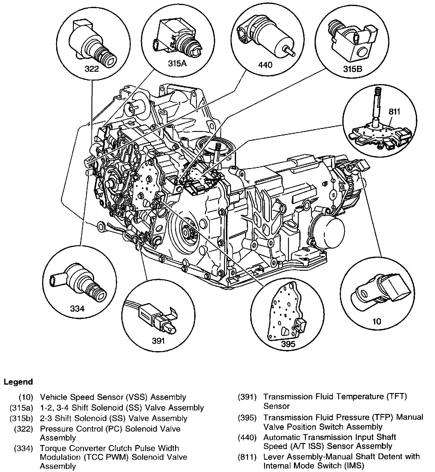 This transmission uses either an externally mounted Transmission Range Switch (TR), Park Neutral Position Switch (PNP) located on the manual valve selector shaft, or an internally mounted Internal Mode Switch (IMS) located inside the automatic transmission, item number 811 in the image.