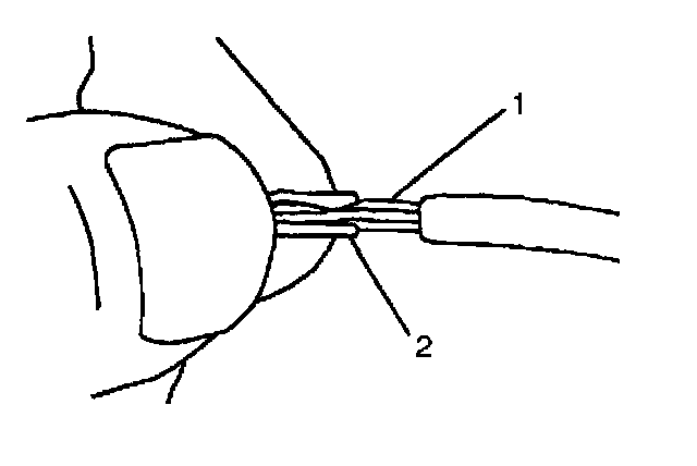 7. Center the splice clip (2) over the stripped wires (1) and hold the clip in place.