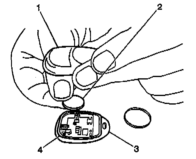 4. Verify that the remote control door lock receiver transmitter (3) is functioning correctly. If not, refer to Transmitter Programming. Programming and Relearning