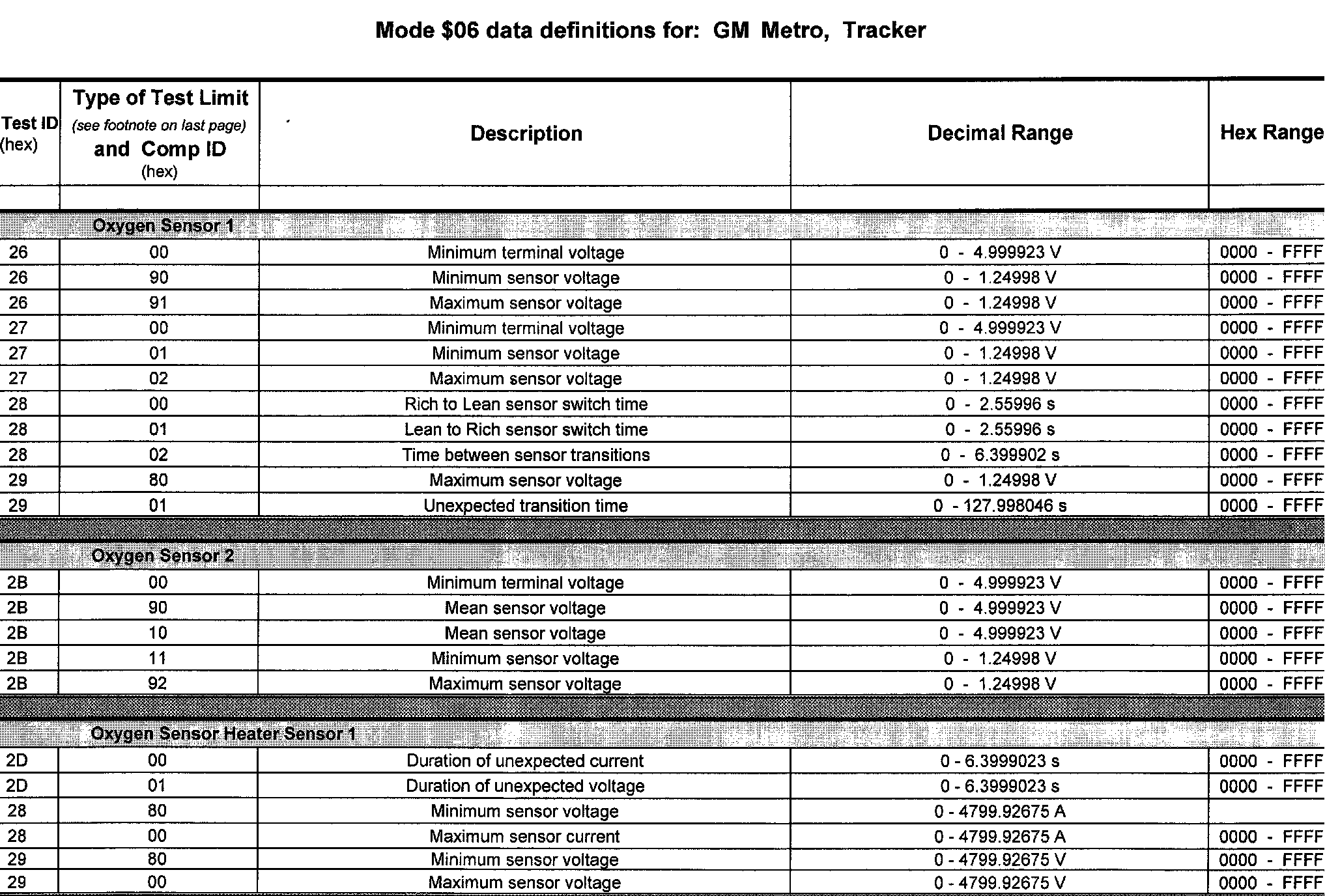 1999-2004 Chevrolet Metro/Tracker Mode 6 Data Description Page 1: