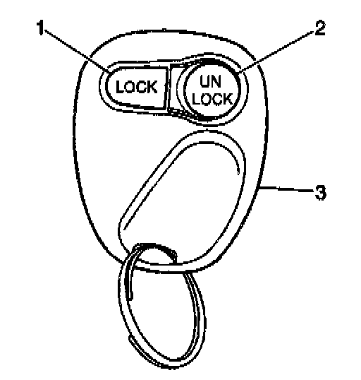 3. To reprogram the next transmitter, press the LOCK (1) and UNLOCK (2) buttons of the transmitter (3) simultaneously until all door locks lock and unlock once each.