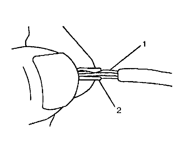 7. Center the splice clip (2) over the stripped wires (1) and hold the clip in place.