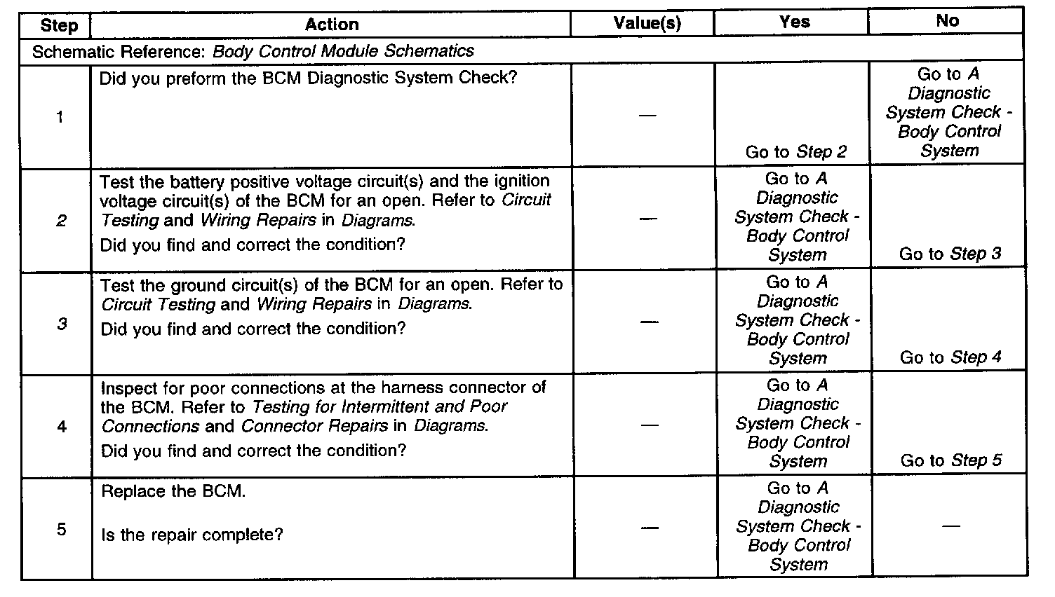 Home >> Chevrolet >> 2000 >> Venture V6-3.4L VIN E >> Repair and Diagnosis >> Powertrain Management >> Computers and Control Systems >> Body Control Module >> Testing and Inspection >> Symptom Related Diagnostic Procedures