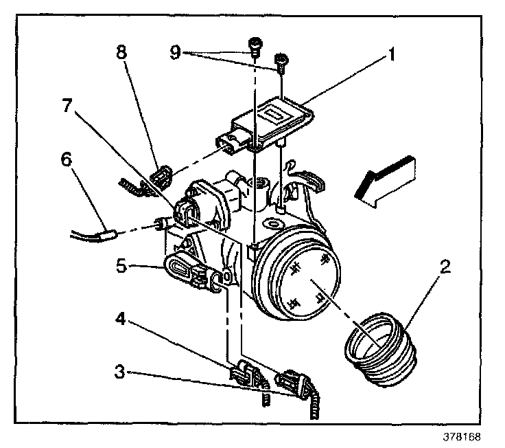 4. Remove the screws (9) that hold the MAF sensor to the throttle body.