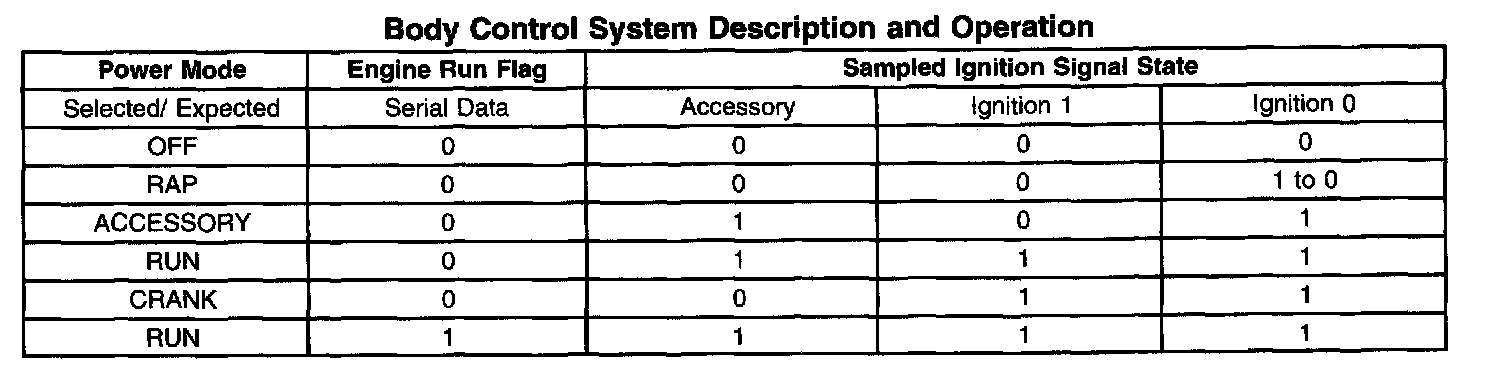 The modules that depend exclusively on serial data messages for power modes stay in the state dictated by the last valid BCM message until they can check for the engine run flag status on the serial data circuits. If the BCM fails, the modules monitor the serial data circuit for the engine run flag serial data. If the engine run flag serial data is True, indicating that the engine is running, the modules fail-safe to RUN. In this state the modules and their subsystems can support all operator requirements. If the engine run flag serial data is False, indicating that the engine is not running, the modules fail-safe to OFF-AWAKE. In this state the modules are constantly checking for a change status message on the serial data circuits and can respond to both local inputs and serial data inputs from other modules on the vehicle.