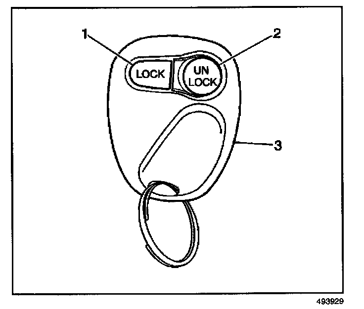 3. To reprogram the next transmitter, press the LOCK (1) and UNLOCK (2) buttons of the transmitter (3) simultaneously until all door locks lock and unlock once each.