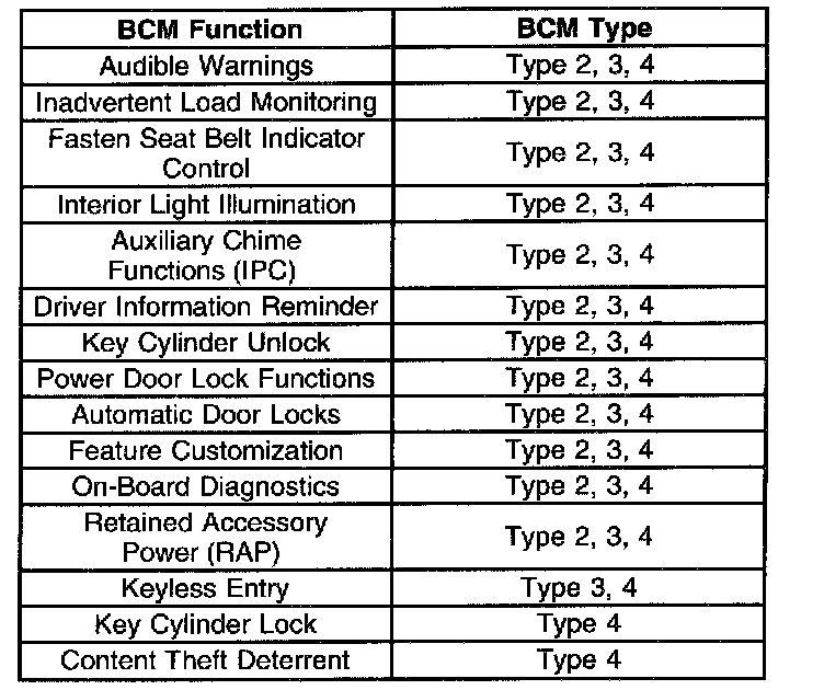 This vehicle is equipped with 1 of 3 types of BCMs. The BCM type installed on this vehicle is based on the vehicle equipment, point of sale, and option content. Refer to On-Board Diagnostic Features for more information on how to identify the BCM type installed by using the on-board diagnostic feature. The following identifies the functions and basic option content of all 3 BCM types: